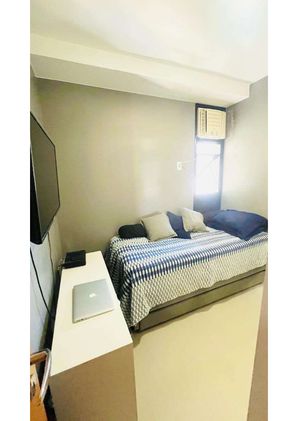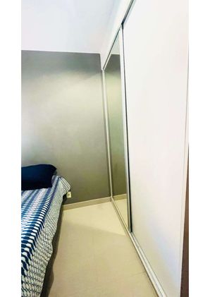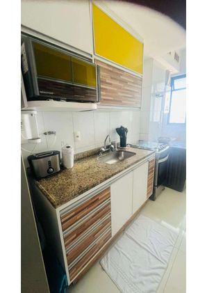 A cozinha é completa em inox e equipada com geladeira side by side, máquina lava e seca, fogão, micro-ondas e filtro de água. O apartamento também conta com mesa de jantar com cadeiras, aparador, sofá-cama de 2,10 m em linho, cama queen, duas escrivaninhas, TVs de 43” na sala e na suíte, persianas nos quartos, armários com portas de correr espelhadas, aquecedor e móveis de varanda. Banheiros com box, armários e espelhos.