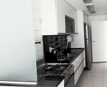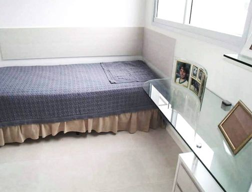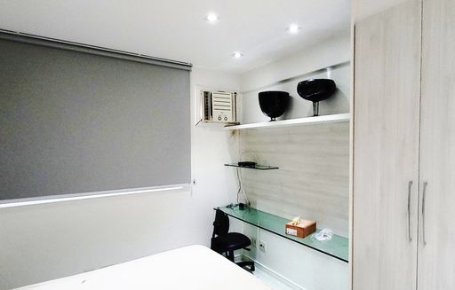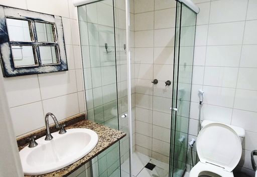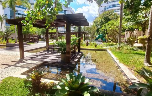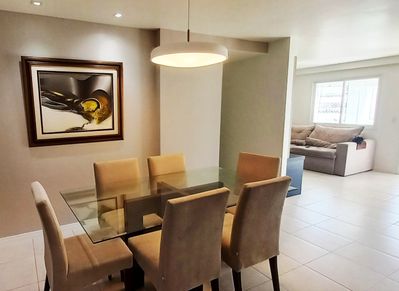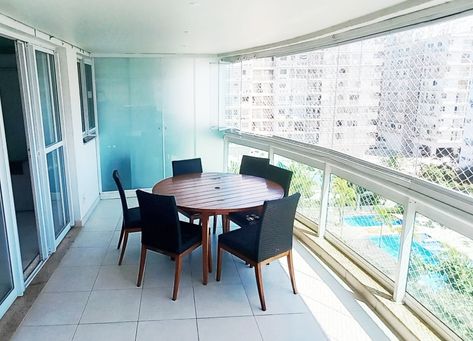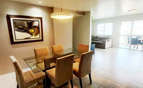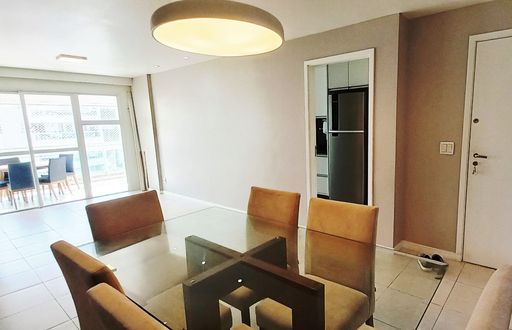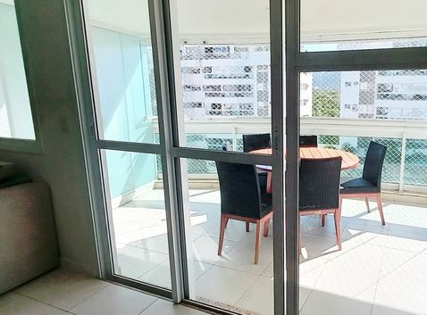 Apartamento mobiliado, localizado no quinto andar, original de quatro quartos, atualmente transformado em três suítes, o que proporcionou uma sala de estar e jantar mais ampla e integrada à sala de TV. A varanda é toda fechada com cortina de vidro e oferece uma vista privilegiada do condomínio.