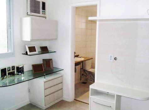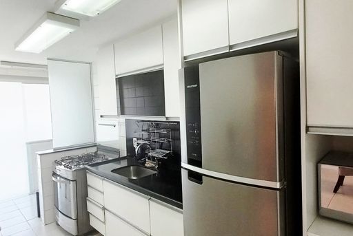 O imóvel conta com cozinha planejada e mobiliário completo da marca Samurai, incluindo armários, mesas, estantes e home theater. Todos os ambientes possuem cortinas e ar-condicionado — de janela nos quartos e split na sala. São quatro banheiros ao todo, sendo três nas suítes (todos com box blindex) e um de serviço.