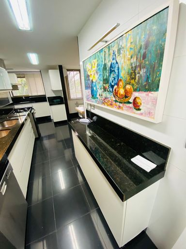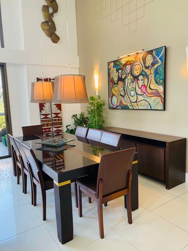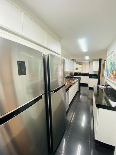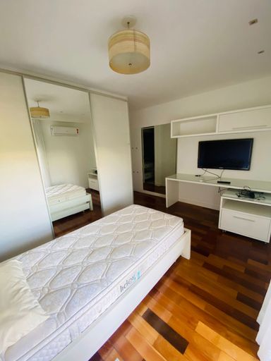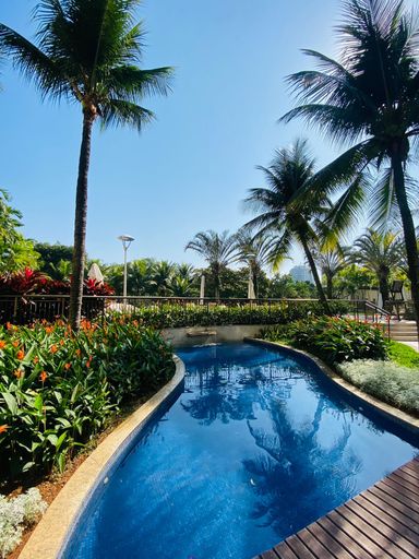 Primeiro pavimento: sala em três ambientes com pé-direito duplo, varanda, suíte térrea, lavabo, copa-cozinha com armários planejados e área de serviço com dependência completa. Segundo pavimento: três suítes com armários planejados e ar condicionados sendo a suíte master com varanda privativa e banheiro com hidromassagem. O condomínio oferece portaria e segurança 24h, piscinas, spa com sauna, ofurô, hidro, academia, home/office, quadras e salão de festas com espaço gourmet, transporte exclusivo para os moradores, incluindo ônibus e balsa para o shopping. Com localização privilegiada na Barra da Tijuca.